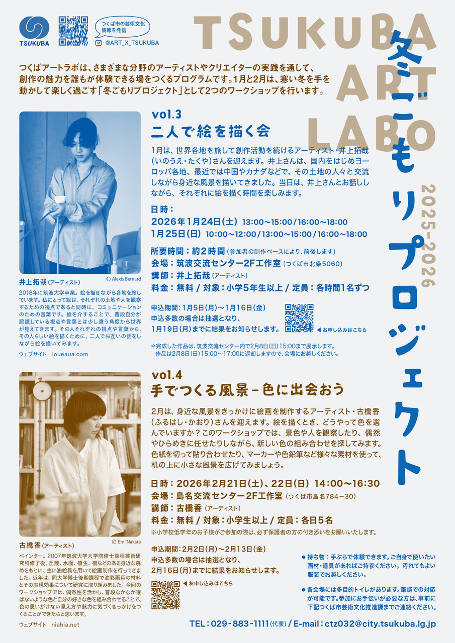 つくばアートラボは、さまざまな分野のアーティストやクリエイターの実践を通して、創作の魅力を誰もが体験できる場をつくるプログラムです。1月と2月は、寒い冬を手を動かして楽しく過ごす「冬ごもりプロジェクト」として2つのワークショップを行います。