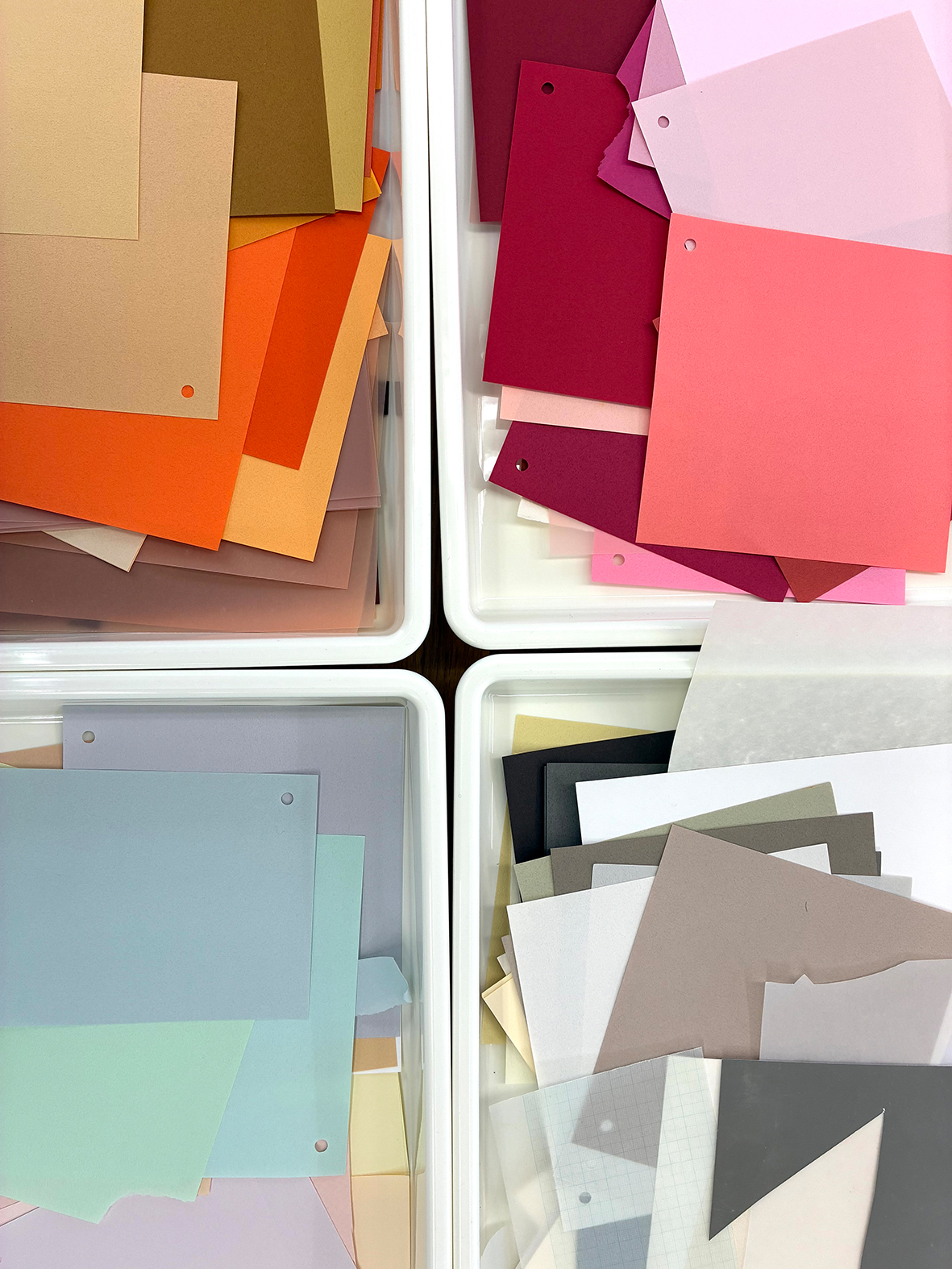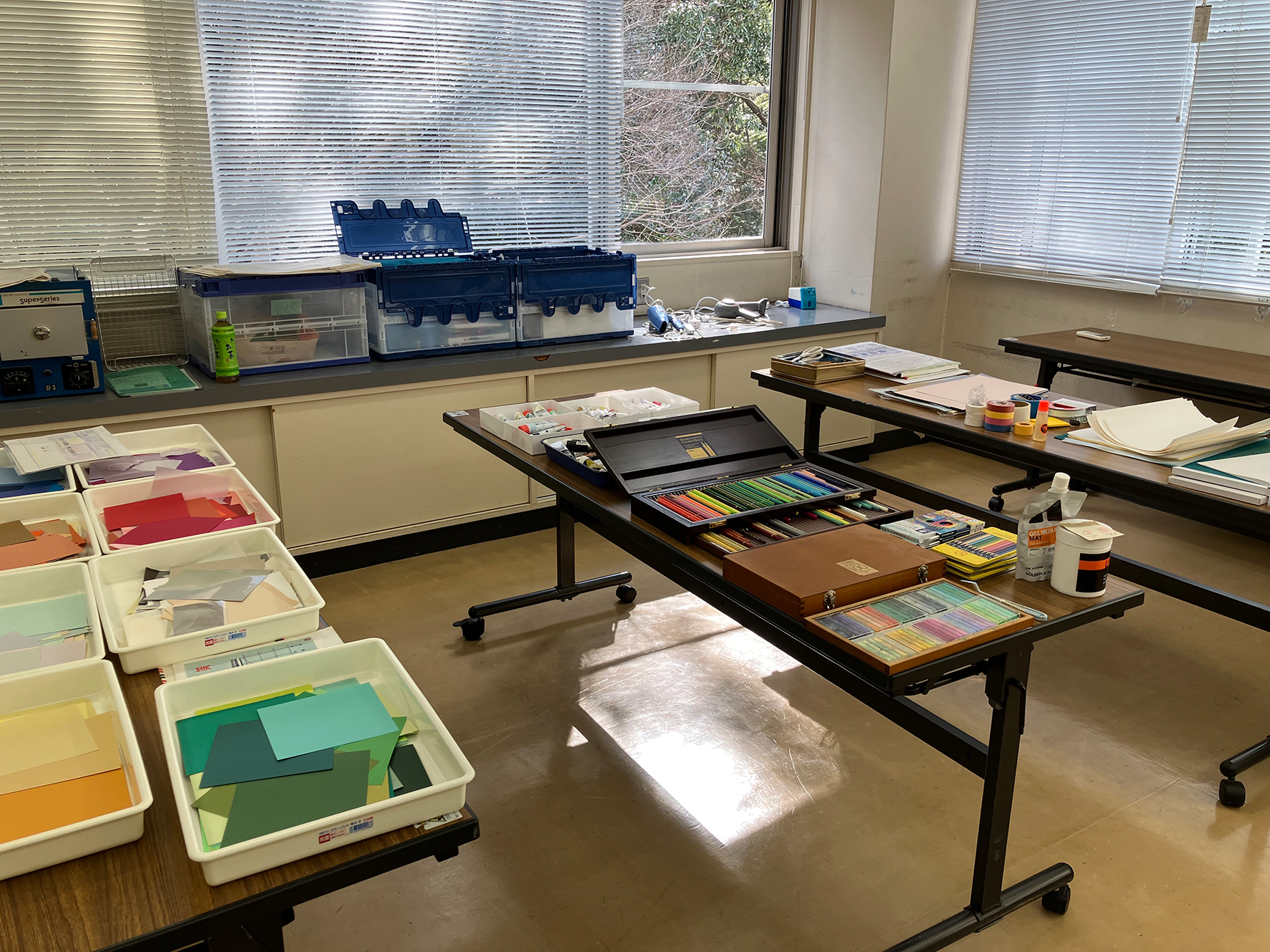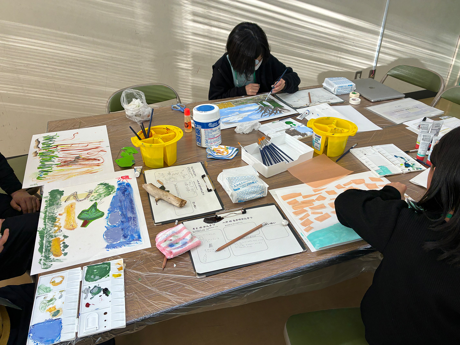 繊細に色を選び調整する人、トレーシングペーパーに絵具、を試す人 などなど