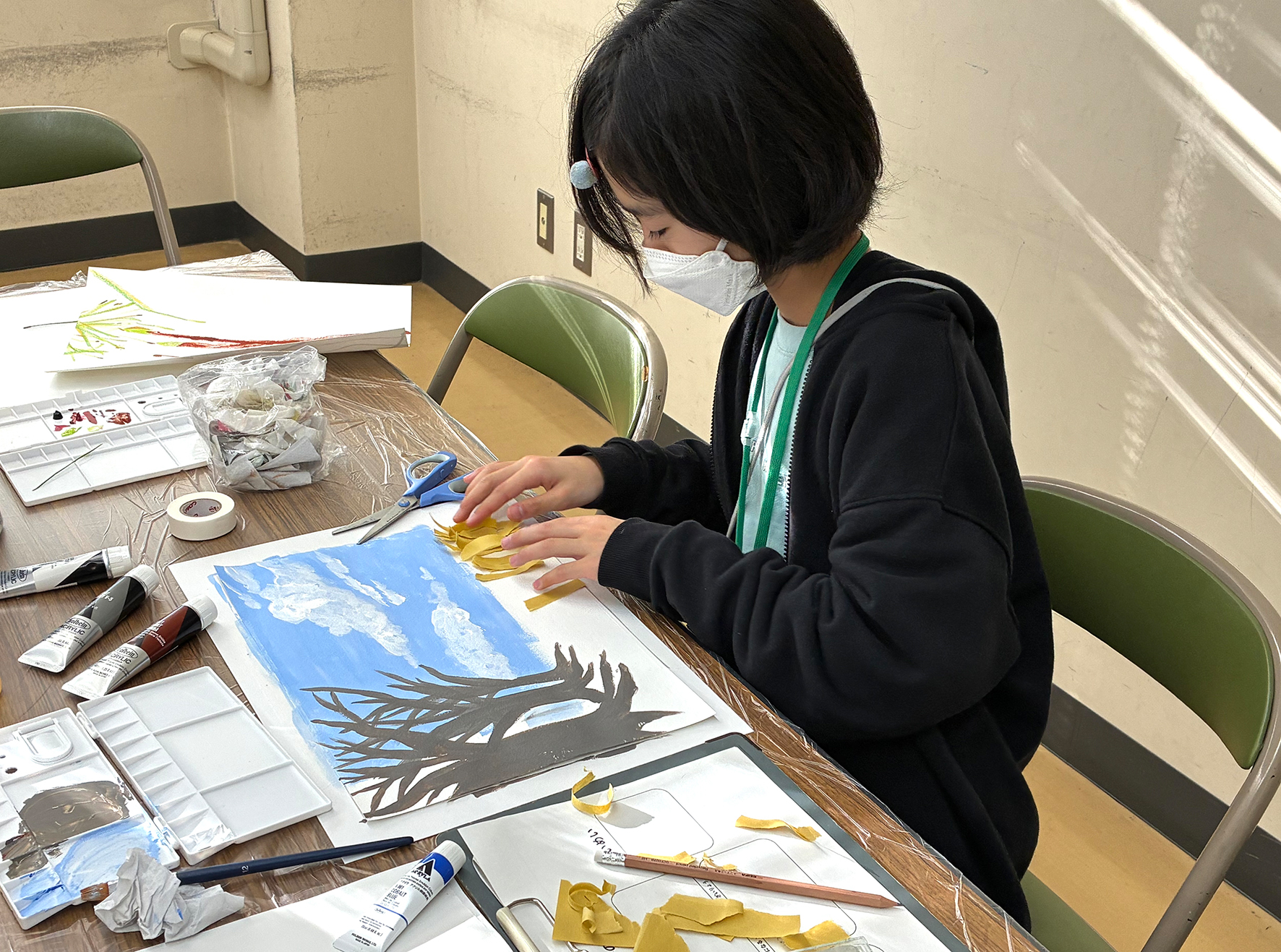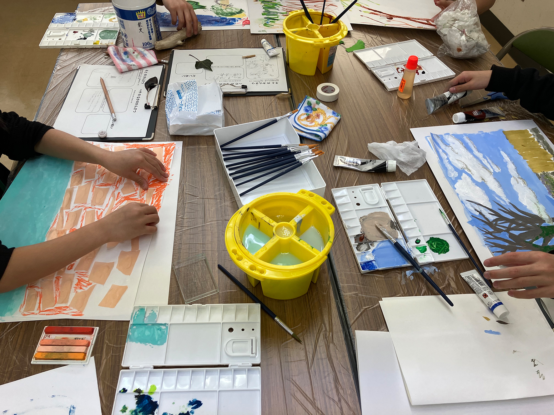 室内に戻り、絵具や色紙などの素材から使いたいものをピックアップ、外で着目したことと組み合わせて、いざ風景をつくってみる。風景を描く、にしなかったところがミソです。