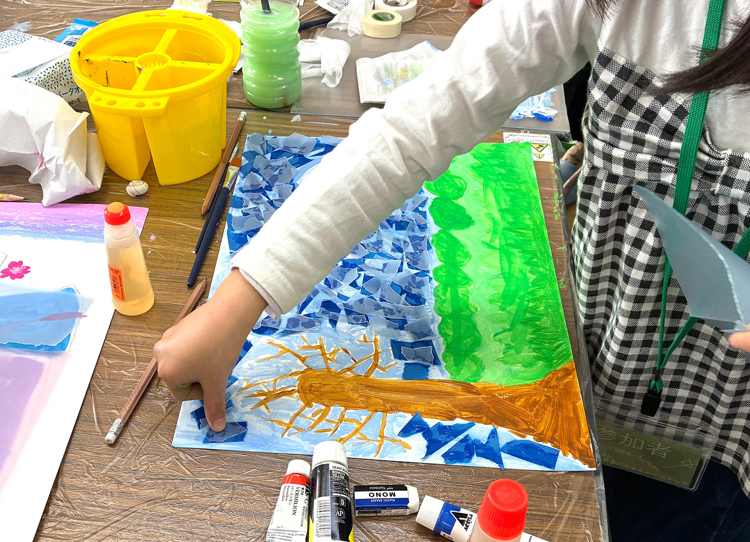 WSで大事にしたのは、つくりながら素材の性質に気づき、それを試して方向転換していく体験。それからタイトルの通り、色紙を使って思いがけない色の組み合わせやよさに気づくことです。